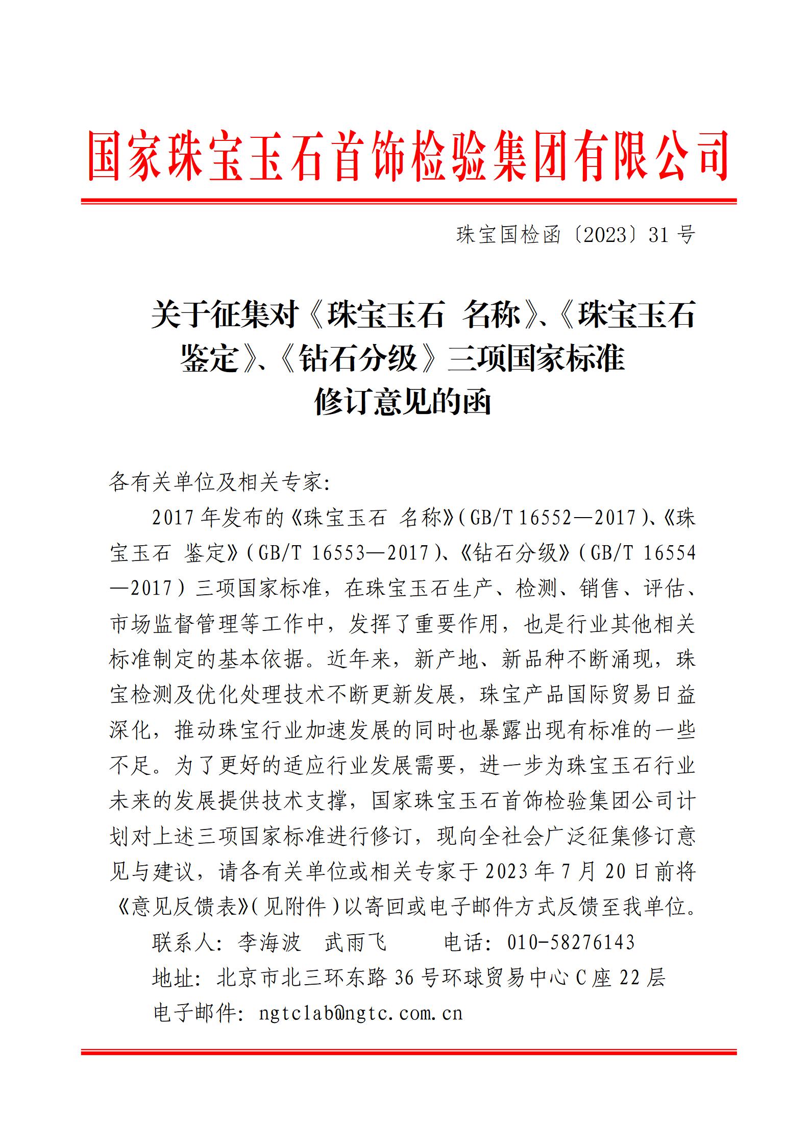 關(guān)于征集對(duì)《珠寶玉石 名稱》、《珠寶玉石 鑒定》、《鉆石分級(jí)》三項(xiàng)國家標(biāo)準(zhǔn)修訂意見的函