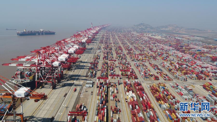 這是2020年3月18日拍攝的上海洋山港集裝箱碼頭(無人機(jī)照片)。新華社記者 丁汀 攝
