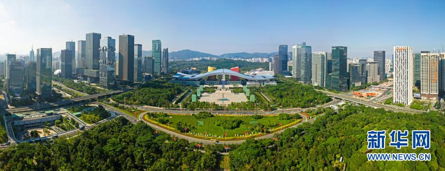 這是2020年10月2日拍攝的深圳市民中心和蓮花山公園一線(無人機(jī)照片)。新華社記者 梁旭 攝