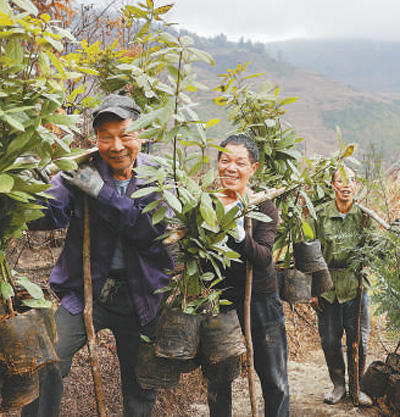 今年3月,浙江省麗水市景寧畬族自治縣鸕鶿鄉(xiāng)西林村,村民挑著樹(shù)苗前往山地種植。李肅人攝(影像中國(guó))