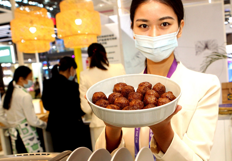 工作人員在第三屆進(jìn)博會(huì)展臺(tái)展示剛出爐的植物蛋白肉丸。新華社記者 陳飛 攝