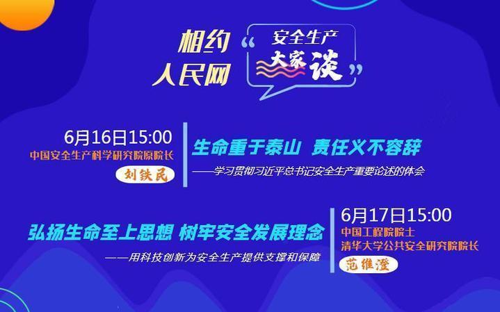6月16日起,與知名專家、企業(yè)安全生產(chǎn)負(fù)責(zé)人和一線技術(shù)工人相約人民網(wǎng),圍繞安全生產(chǎn)責(zé)任落實(shí)、隱患排查、風(fēng)險(xiǎn)管控、應(yīng)急處置等內(nèi)容,學(xué)習(xí)安全生產(chǎn)知識(shí)技能,交流心得體會(huì)。6月16日15:00,中國(guó)安全生產(chǎn)科學(xué)研究院原院長(zhǎng)劉鐵民,講授學(xué)習(xí)貫徹習(xí)近平總書(shū)記關(guān)于安全生產(chǎn)重要論述體會(huì);6月17日15:00,中國(guó)工程院院士、清華大學(xué)公共安全研究院院長(zhǎng)范維澄,講授科技創(chuàng)新保障安全生產(chǎn);其他講授內(nèi)容陸續(xù)推出。