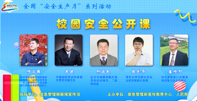 6月16日19:00登錄人民網(wǎng),與北京地震局重大項(xiàng)目總技術(shù)指導(dǎo)邢成起、北京消防救援總隊(duì)原副總隊(duì)長(zhǎng)李進(jìn)、清華合肥公共安全研究院院長(zhǎng)助理梁光華、張家口教育局科長(zhǎng)崔祥烈、教育部某課題組長(zhǎng)何衛(wèi)國(guó)等5位專家,交流學(xué)習(xí)防震減災(zāi)、消防安全、校園安全、陽(yáng)光校園等方面內(nèi)容,線上答疑釋惑,幫助提高學(xué)生應(yīng)急避險(xiǎn)和自救互救能力。