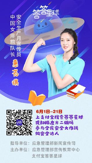 6月1日-21日,登錄支付寶答答星球開(kāi)啟挑戰(zhàn)之旅,與安全達(dá)人PK安全知識(shí),中國(guó)女排前隊(duì)長(zhǎng)惠若琪為你加油打氣,快來(lái)參加吧!