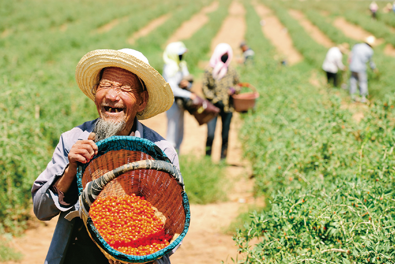 閩寧兩省區(qū)成功實現(xiàn)了援助式扶貧向開發(fā)式扶貧轉變。福建的人才、資金、技術、市場等要素與寧夏貧困地區(qū)的土地、特色農(nóng)產(chǎn)品和勞動力資源有機結合,帶動了當?shù)噩F(xiàn)代農(nóng)業(yè)和特色優(yōu)勢產(chǎn)業(yè)的發(fā)展。一個個特色優(yōu)勢產(chǎn)業(yè)集群正在改變著西海固落后的生產(chǎn)結構和傳統(tǒng)的生活方式。圖為寧夏同心縣農(nóng)民種植的枸杞喜獲豐收。 寧夏區(qū)委宣傳部供圖 李君杰/攝