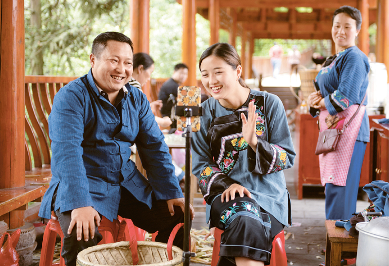 圖為2020年5月15日,湖南省十八洞村第三任駐村扶貧工作隊隊長麻輝煌(左)與返鄉(xiāng)大學生施林嬌一起通過網(wǎng)絡(luò)直播推銷土特產(chǎn)。 新華社發(fā) 陳思汗/攝