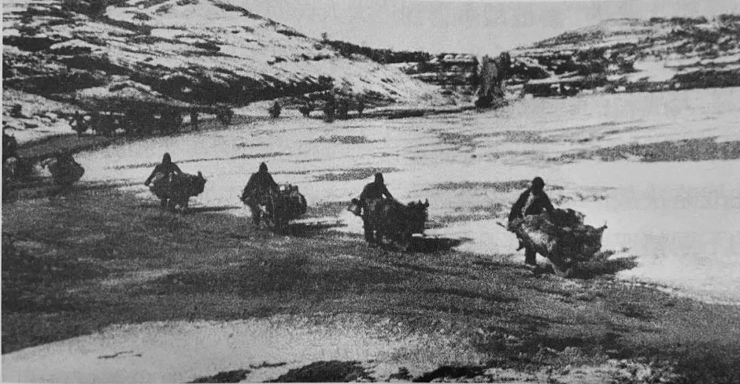 三大戰(zhàn)役期間,解放區(qū)農(nóng)民在冰天雪地中用小車把彈藥、物資運往前線。圖片來源:《中國共產(chǎn)黨的九十年》