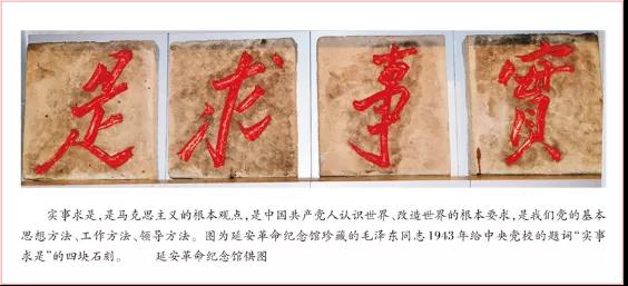 延安革命紀念館有四塊鎮(zhèn)館之寶,就是毛澤東同志在1943年給中央黨校的題詞“實事求是”的四塊石刻,每塊石刻長70厘米、寬63.5厘米、高14.5厘米。