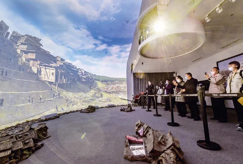 近年來,重慶紅巖革命紀(jì)念館以新技術(shù)把革命文物搬上屏幕和舞臺(tái),創(chuàng)新革命文物展示,讓紅巖革命文物“活”起來。圖為在重慶紅巖革命紀(jì)念館“紅巖記憶”數(shù)字體驗(yàn)廳內(nèi),觀眾們觀看以雙曲三維穹幕技術(shù)展示的場(chǎng)景。 新華社記者 李賀/攝