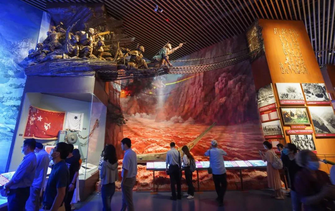 2021年7月15日起,中國共產(chǎn)黨歷史展覽館正式面向社會公眾開放。圖為觀眾在中國共產(chǎn)黨歷史展覽館“‘不忘初心、牢記使命’中國共產(chǎn)黨歷史展覽”上觀看飛奪瀘定橋展陳。新華社記者 陳曄華/攝