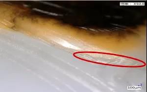 經(jīng)過檢測(cè)人員的仔細(xì)觀察發(fā)現(xiàn),有皮色部位與白色主體接觸的部位具有強(qiáng)藍(lán)白色熒光,且形成封閉的環(huán)形;在特殊角度下使用高倍顯微鏡觀察,可以看到非常細(xì)小的拼合縫,如不留意觀察則極難發(fā)現(xiàn)。