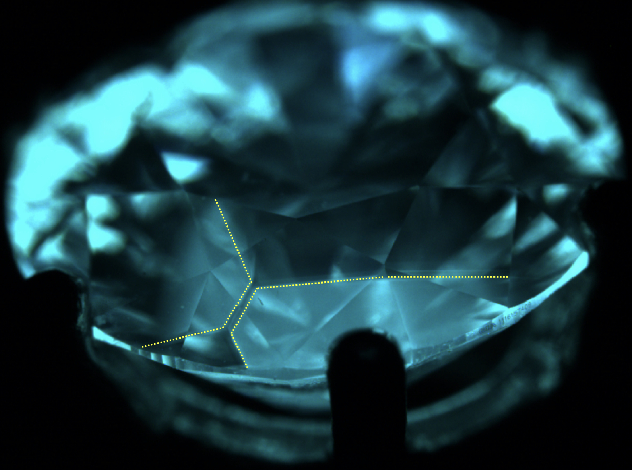 圖5熒光觀察圖像,黃色虛線所示高溫高壓合成鉆石生長分區(qū)