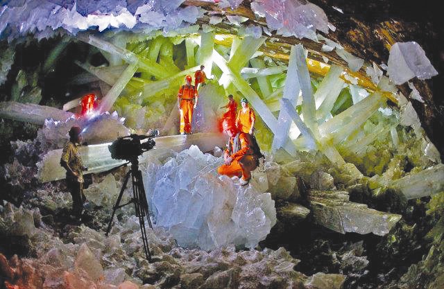 晶體生長的大小與其自身性質(zhì)和形成的地質(zhì)條件有關(guān)。通常情況下,礦物晶體由于受到空間限制,個體都不是很大,那么如果有足夠的空間與時間,晶體到底能長到多大呢?奈卡水晶洞是世界上最大的水晶洞穴,它位于墨西哥奇瓦瓦沙漠奈加山脈下305米深處。其洞穴內(nèi)長條的晶體是無水石膏晶體,這些半透明的巨型晶體長度達到了11米,重達55噸,非常巨大。