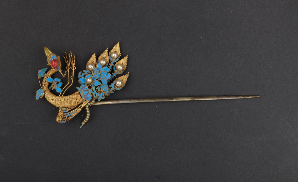 點(diǎn)翠嵌珠寶鎏金銀鳳簪,清代,孔府舊藏。銀質(zhì)鎏金;鳳形,整器以累絲和點(diǎn)翠等工藝裝飾,鑲嵌紅寶石、珍珠點(diǎn)綴。“簪”是古時(shí)漢族婦女的一種發(fā)飾,是古代婦女發(fā)型中最基礎(chǔ)的固定和裝飾工具,由“笄”發(fā)展而來(lái)的,用來(lái)綰定發(fā)髻或冠的長(zhǎng)針?!逗鬂h書(shū)·輿服志》有:“黃金龍首銜白珠,魚(yú)須擿,長(zhǎng)一尺,為簪珥”的記載。