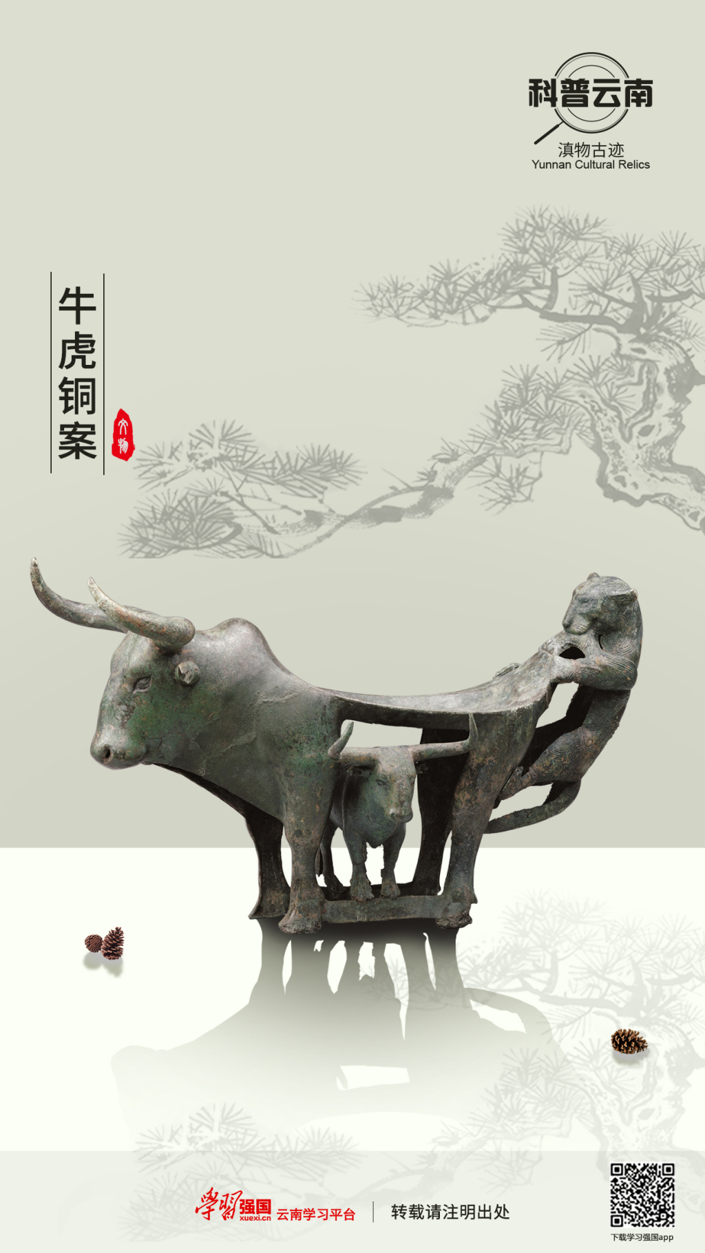 文物描述:此案由一虎二牛組成:主體為一立牛,巨角前伸,肩部隆起,四條腿作案足,牛背下凹呈盤(pán)狀作案面;牛后部攀爬狀一虎,躬身下垂,咬住牛尾,前爪緊扣案沿,后腿蹬于牛腿上;大牛腹下中空,一頭巨角前伸體量較小的牛橫向立于大牛前后腿間橫檔上。器物表現(xiàn)主題為滇國(guó)青銅器常見(jiàn)的“虎噬牛”題材,系分體鑄造后再鑄接而成。?;~案造型奇巧,動(dòng)靜結(jié)合,比例協(xié)調(diào),立意豐富,作為云南民族文化的標(biāo)志性器物之一,既有中原地區(qū)四足案的特征,又具有濃郁的地方特點(diǎn)和民族風(fēng)格,堪稱(chēng)中國(guó)青銅藝術(shù)品之杰作。