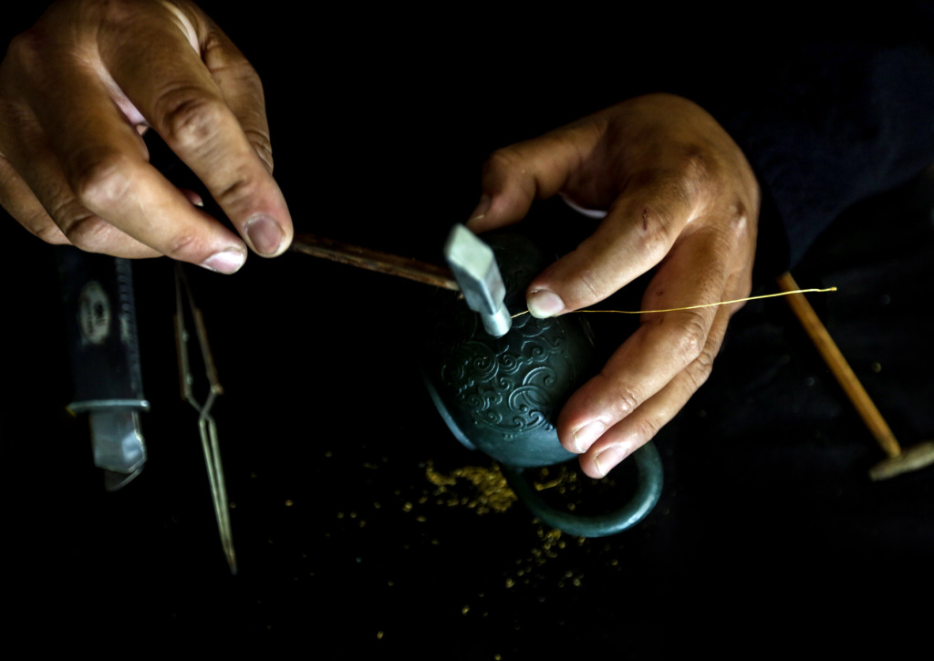 8月19日上午,天空下著小雨,記者走進(jìn)位于河北衡水高新區(qū)大麻森鄉(xiāng)肖家屯村的“坤宸居”小院,感受傳統(tǒng)技藝的魅力?!昂芏嗳藢Αe金銀’比較陌生,但說起金鑲玉就比較熟悉了?!蓖鯘d致勃勃地講起“錯金銀”的前世今生:“凡是在金屬、玉器等器皿上繪制或雕制金銀圖案都被稱為‘錯金銀’,這是中國古老復(fù)雜的裝飾工藝,最早見于商周時代的青銅器,漢代達(dá)到一個頂峰。由于制作過程需要精雕細(xì)鏨、繁復(fù)費時,時至今日,能夠掌握‘錯金銀’工藝的師傅少之又少?!?/p>