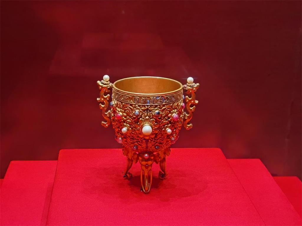 外壁滿鏨寶相花,花蕊以珍珠及紅、藍(lán)寶石為主。杯口沿鏨回紋一周,一面中部鏨刻“金甌永固”,一面鏨刻“乾隆年制”四字款。兩側(cè)有夔龍雙耳守護(hù),龍頭上有珠。三只足皆為象首式,象耳略小,長(zhǎng)牙卷鼻,額頂及雙目間亦嵌珠寶。金杯通體鏨刻的是纏枝寶相花紋,花紋間充盈著皇家點(diǎn)翠工藝,這就是現(xiàn)藏于北京故宮博物院的金嵌珠石金甌永固杯。