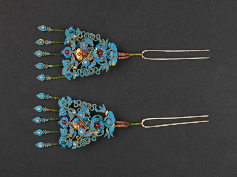 點(diǎn)翠嵌珠福壽紋銀釵,清代,孔府舊藏,現(xiàn)藏于孔子博物館。銀質(zhì)鎏金;以點(diǎn)翠工藝飾蝙蝠、壽桃、雙錢、竹葉、花卉等紋,鑲嵌各色寶石裝飾。寓意福祿萬代,福至眼前。