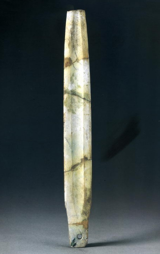 三星堆一號祭祀坑出土,殘長28.2厘米,寬3.4厘米。前鋒殘斷,劍身呈竹葉狀,一面凸起,另一面兩側平,中間呈弧形下凹。扁莖無格,莖上有一圓穿。玉制的劍目前在全國僅此一件,其形狀與后來在四川地區(qū)廣為流行的一種青銅“柳葉劍”很相似,應是巴蜀式劍的鼻祖。