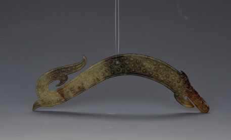 呈扁平弧形,有沁。龍俯首,張口前視,背部拱起呈弧形,尾分叉,背有一穿孔。龍身一面飾榖紋,一面飾卷云紋。