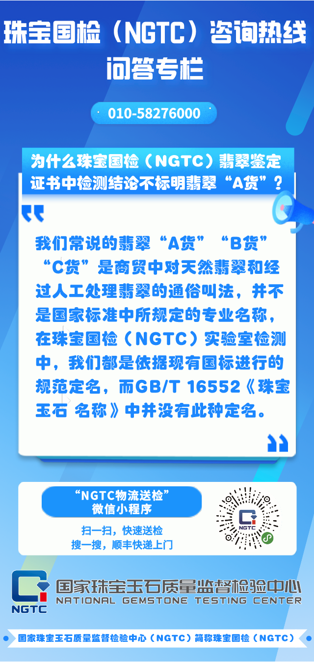 【珠寶國檢(NGTC)咨詢熱線問答專欄】為什么珠寶國檢(NGTC)翡翠鑒定證書中檢測結論不標明翡翠“A貨”?