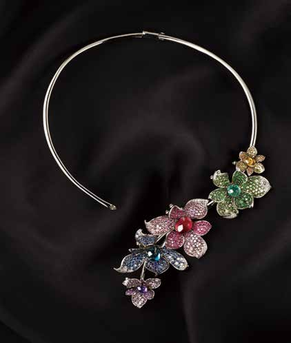色彩的對比運用在珠寶首飾設(shè)計中較為靈活,有時也有多種顏色的寶石同時出現(xiàn)的情況,以增強活潑靈動的感覺。