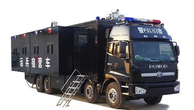 宿營車是為滿足特殊環(huán)境下野外執(zhí)行任務、提高后勤保障能力研制開發(fā)的專用車輛。由越野型二類底盤加裝大板式方艙組成,方艙通過液壓系統(tǒng)傳動、電氣系統(tǒng)控制實現(xiàn)左右兩側自動擴展。車輛配有空調和燃油暖風機,可保證方艙內的溫度恒定在人體最適合的溫度。車內具有能同時滿足32人的住宿空間,集住宿、運輸及影視娛樂為一體,滿足公安、部隊處理突發(fā)性任務的快速機動需要。具有功能齊全、性能優(yōu)良、操作簡便、保障能力強、適應性廣等特點。