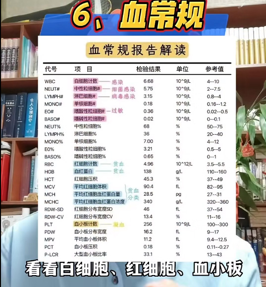 因為如果高血壓同時合并了同型半胱氨酸升高那么腦梗的風(fēng)險就會增加。所以很有必要對高血壓的人來講,查一個同型半胱氨酸。血糖血脂100個人中就有10個糖尿病的人數(shù)據(jù)來源《中國血脂管理指南》。長期高血脂糖尿病,如果沒有得到有效的控制,會增加血管堵塞的風(fēng)險,所以我們要查一查我們的血脂四項,查一個空腹血糖。也沒必要做一個生化全套。意義不是很大。高尿酸容易引起痛風(fēng)。也會增加心血管疾病的風(fēng)險。尿酸一般在這個腎功能當(dāng)中,順便查一下肌酐、尿素氮、電解質(zhì)、鉀鈉氯。肝功能的簡項,肝功能也有很多種,查相對比較簡單的,別整太多的。最后就是差血常規(guī),看看白細(xì)胞、紅細(xì)胞、血小板看看有沒貧血也就足夠了。其實就是抽兩管血,這也是最基礎(chǔ)最重要的幾個檢查項目。