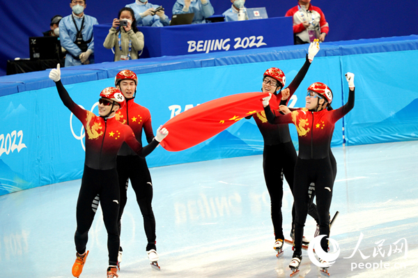 人民網(wǎng)北京2月6日電 (記者胡雪蓉)5日晚,北京冬奧會短道速滑項目決出首枚金牌。在混合團體接力的決賽中,由曲春雨、范可新、張雨婷、武大靖、任子威組成的中國隊以2分37秒348的成績獲得冠軍,這也是中國代表團在北京冬奧會上奪得的首枚金牌。