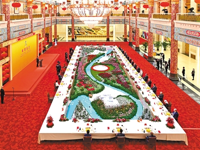宴會(huì)在喜慶歡樂(lè)祥和的氣氛中進(jìn)行。結(jié)束時(shí),習(xí)近平和彭麗媛同國(guó)際貴賓們?cè)凇兑黄鹣蛭磥?lái)》的樂(lè)曲聲中揮手道別。