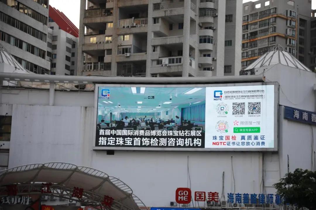 5月4日-10日,珠寶國檢(NGTC)都市大屏配合首屆中國國際消費品博覽會(下簡稱消博會)同期亮相??谏倘Γ謩e在國貿(mào)京茂百貨大屏、東方廣場大屏、南亞廣場大屏、名門廣場大屏進行形象宣傳。