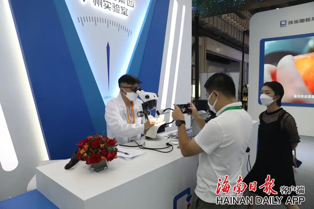 珠寶國(guó)檢集團(tuán)廣州實(shí)驗(yàn)室質(zhì)檢師在消博會(huì)現(xiàn)場(chǎng)為消費(fèi)者提供鑒定服務(wù)。海南日?qǐng)?bào)記者 邱肖帥 攝