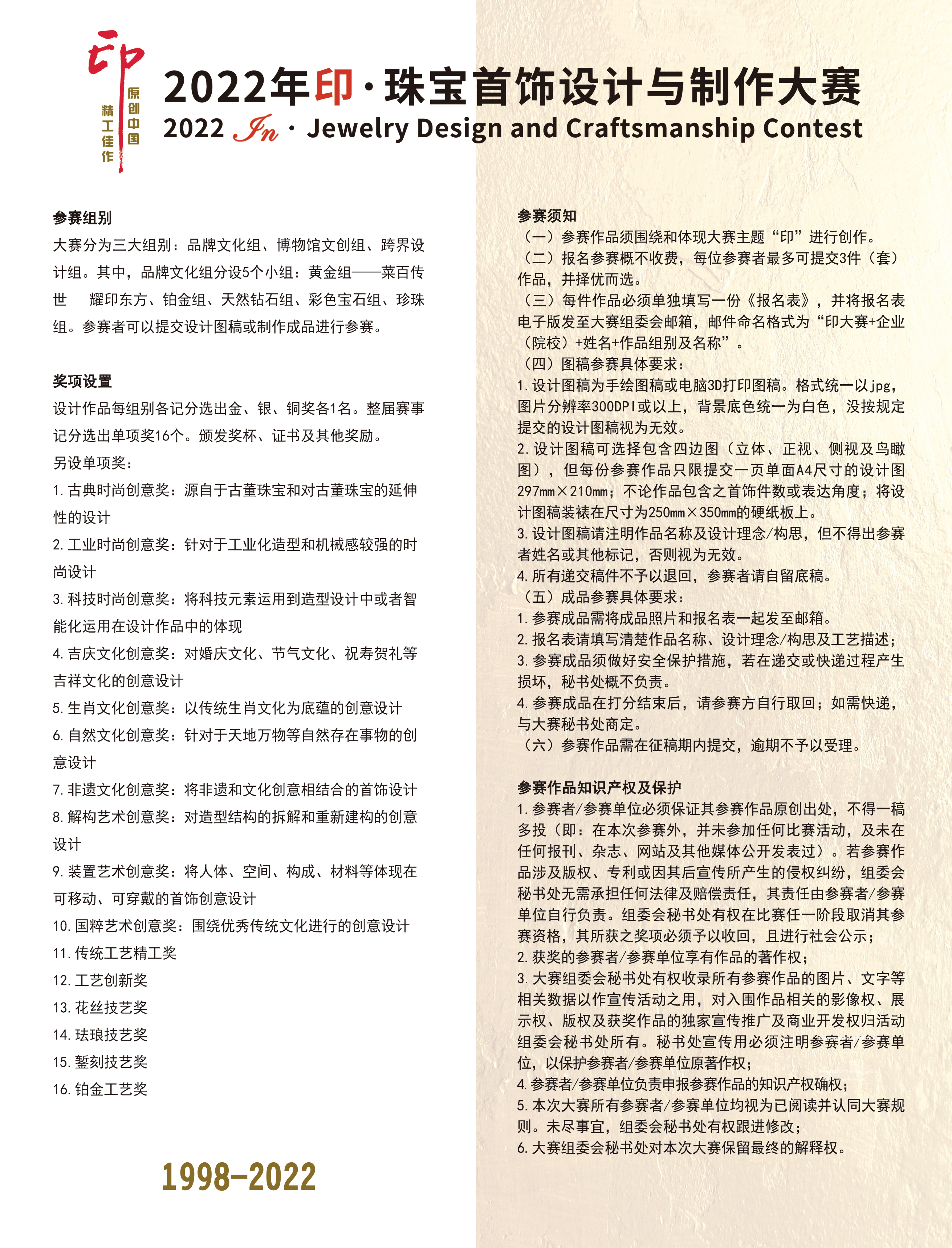 1998年,由珠寶國檢和中寶協(xié)聯(lián)合主辦,潮宏基品牌冠名,周大福、菜百、老鳳祥等零售品牌和全國高校積極參與的設計大賽,開創(chuàng)了行業(yè)有組織的發(fā)現(xiàn)、培育、推廣中國原創(chuàng)設計和設計師的先河。2007年,仍由珠寶國檢和中寶協(xié)聯(lián)合主辦,寶怡、星光達、緣與美、周大生等25家制造業(yè)和零售業(yè)頭部品牌發(fā)起,由人力資源和社會保障部相關部門批準的制作大賽(國家賽),開啟了在珠寶首飾制造行業(yè)培育大國工匠的序幕。2012年,設計大賽和制作大賽合并,以“印”為大賽永恒主題。