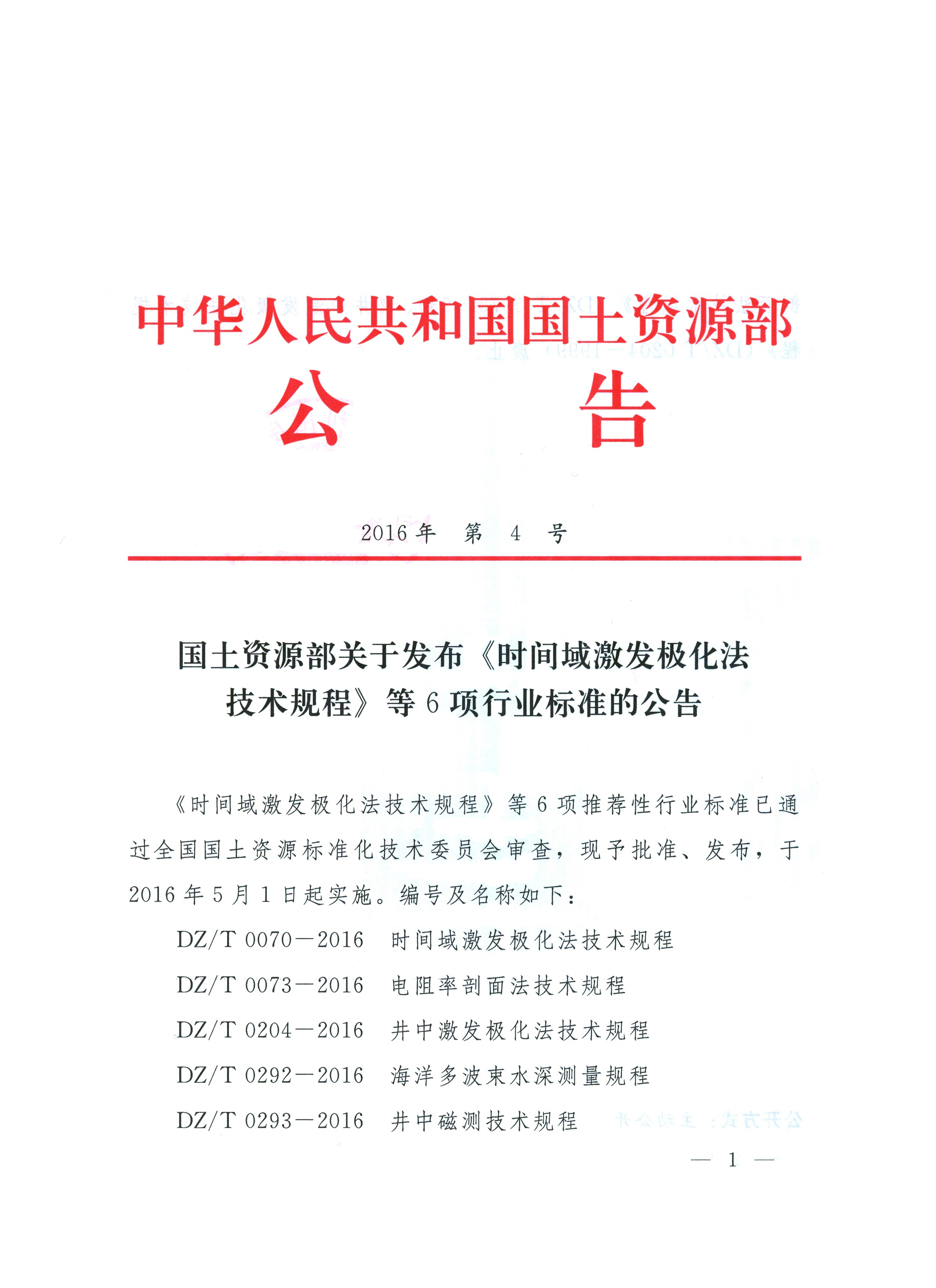 國土資源部關(guān)于發(fā)布《時間域激發(fā)極化法技術(shù)規(guī)程》等6項(xiàng)行業(yè)標(biāo)準(zhǔn)的公告