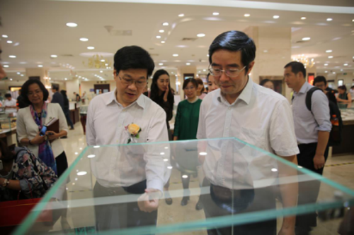 寶石中心葉志斌主任(右)與北京市文資辦周茂非主任(左)共同參觀“邂逅白堊紀——蟲珀珍寶展”