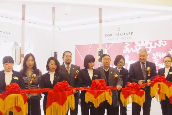 國家珠寶玉石質(zhì)量監(jiān)督檢驗(yàn)中心(NGTC)副主任孫鳳民先生,瑞恩鉆飾董事長兼總經(jīng)理薛雷先生,F(xiàn)orevermark?永恒印記?北區(qū)銷售經(jīng)理劉爽女士,悠唐廣場總經(jīng)理中野先生出席開業(yè)活動(dòng)并剪彩。