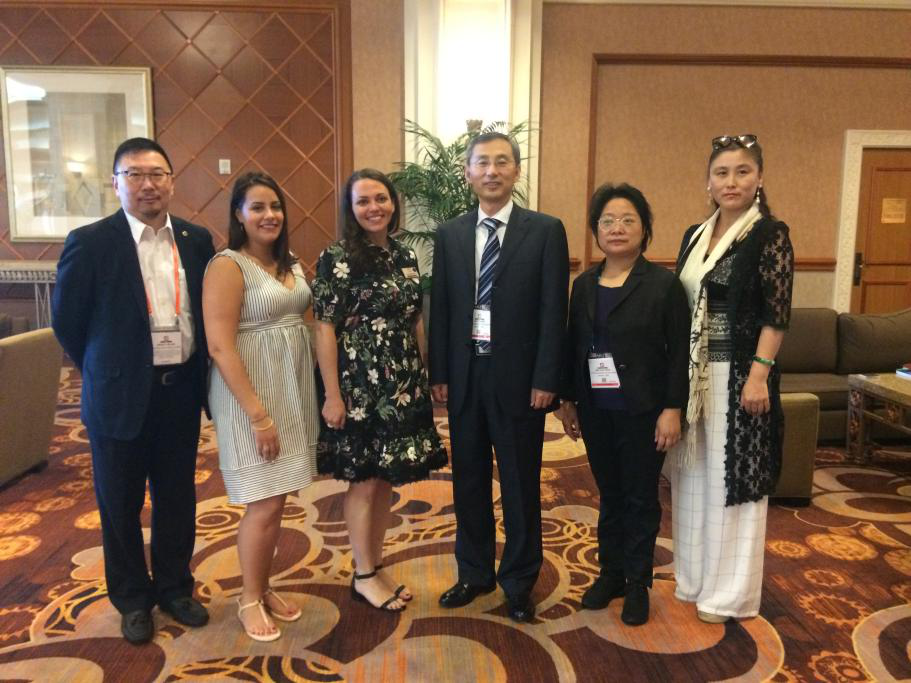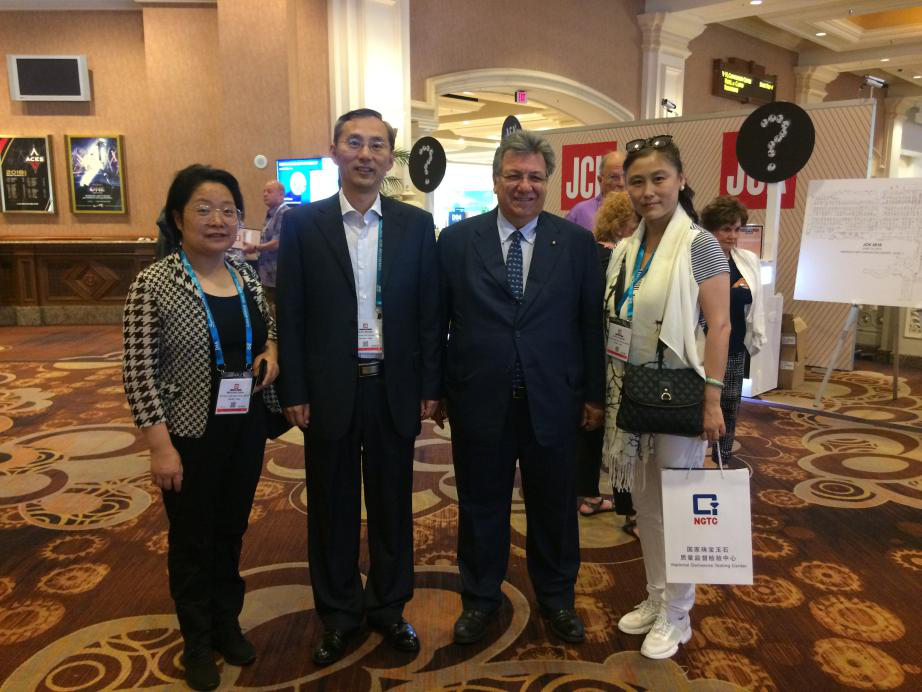 NGTC副主任張曉(左二),信息中心主任沈美冬(左一)、宣傳推廣部主任孟曉珺(右一)與國際珠寶首飾聯(lián)合會(CIBJO)主席GAETANO CAVALIERI(右二)合影