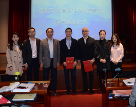國(guó)檢珠寶培訓(xùn)中心(NGTC)李寶軍主任為來(lái)自深圳國(guó)藝珠寶藝術(shù)品資產(chǎn)評(píng)估有限公司總經(jīng)理潘海華和副總經(jīng)理薛曉昕頒發(fā)NGTC評(píng)估課程特聘教師證書