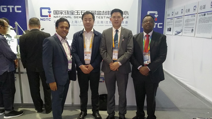 NGTC上海實(shí)驗(yàn)室主任王新民(左二)與來自肯尼亞BEMA國際貿(mào)易公司的George Kariithi 博士(右一)、中國歐洲經(jīng)濟(jì)技術(shù)合作協(xié)會上海辦事處執(zhí)行主任汪赟(右二)、印度珠寶商Sandeep(左一)在NGTC展位前合影