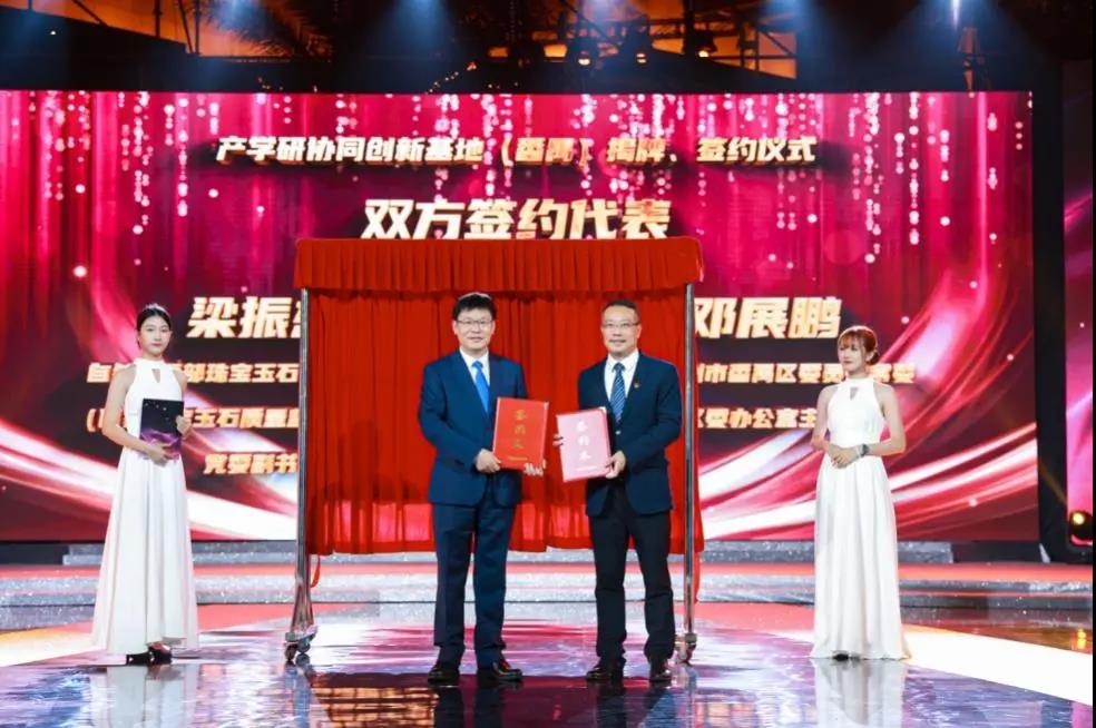 梁振杰與中共廣州市番禺區(qū)委員會(huì)常委、區(qū)委辦公室主任鄧展鵬一同為自然資源部珠寶玉石首飾檢驗(yàn)評(píng)價(jià)技術(shù)創(chuàng)新中心產(chǎn)學(xué)研協(xié)同創(chuàng)新基地(番禺)揭牌,創(chuàng)新基地正式落戶(hù)番禺,預(yù)示基地的各合作方將在 “共商、共建、共贏、共享”共識(shí)下,攜手深化合作,共同促進(jìn)番禺珠寶產(chǎn)業(yè)的高質(zhì)量發(fā)展。