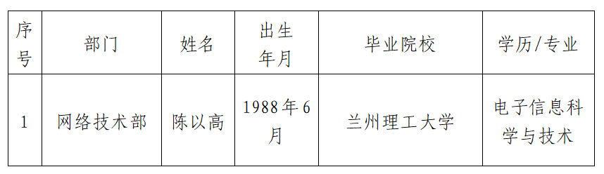 按照自然資源部珠寶玉石首飾管理中心招聘工作方案要求,經(jīng)過發(fā)布招聘公告、資格審查、面試、體檢等程序,經(jīng)黨委會議研究,擬聘用陳以高同志為網(wǎng)絡技術(shù)部工作人員,現(xiàn)予以公示。