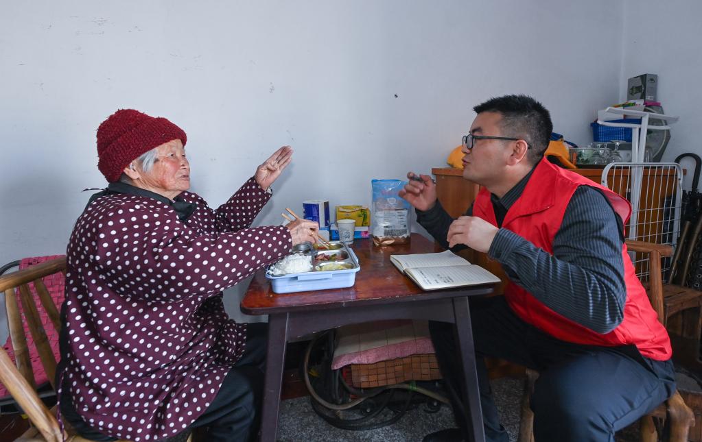 3月28日,在杭州市臨安區(qū)昌化鎮(zhèn)聯(lián)盟村,網(wǎng)格黨員栗雪鋒(右)為90歲的獨居老人帥美珠送餐,并了解她當前的困難和需求。新華社記者 徐昱 攝