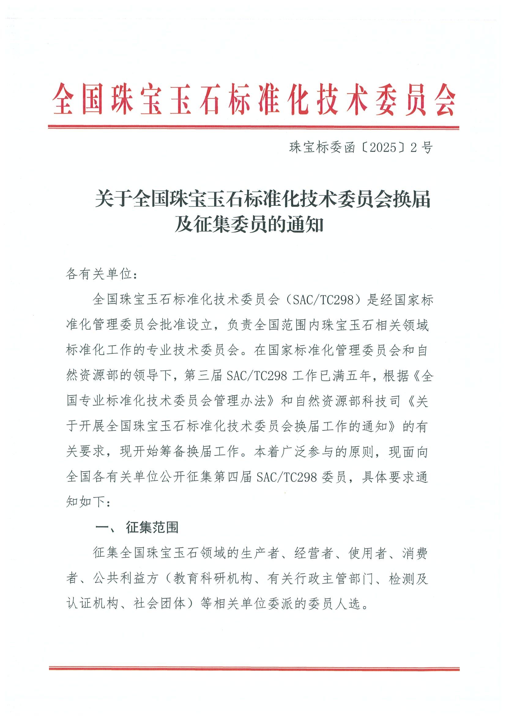 關(guān)于全國珠寶玉石標(biāo)準(zhǔn)化技術(shù)委員會(huì)換屆及征集委員的通知