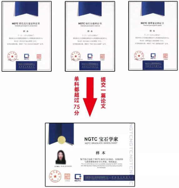 三年內(nèi)擁有“鉆石分級(jí)師”、“彩色寶石鑒定師”和“翡翠鑒定師”三種證書,單科成績超過75分,并提交一篇論文,便可獲得國家珠寶玉石質(zhì)量監(jiān)督檢驗(yàn)中心和國檢珠寶培訓(xùn)中心聯(lián)合頒發(fā)的“NGTC寶石學(xué)家”證書。