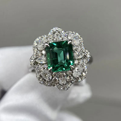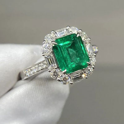 名貴的祖母綠,給人安靜柔和又充滿生機(jī)勃勃之感。方形切割的祖母綠主石晶體干凈通透,外圈鑲配耀眼鉆石,戒壁兩側(cè)點(diǎn)綴花形美鉆,給人們營(yíng)造出清新雅致的視覺美感。