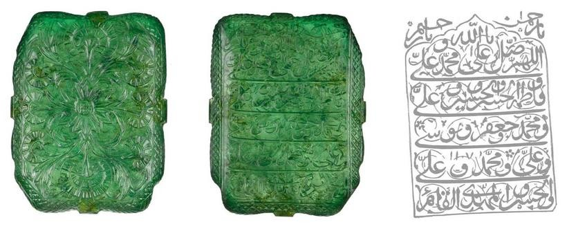 歷史上另一個具有傳奇色彩的哥倫比亞祖母綠——“莫臥兒帝國祖母綠”(Mogul Mughal Emerald),是一塊重量達217.8克拉的祖母綠雕刻件,該祖母綠同樣產(chǎn)自哥倫比亞,曾被17世紀莫臥兒王朝的一位貴族收藏。它正面刻有阿拉伯文祈禱文并且標注了阿拉伯紀年1107年(相當于公元1695年),背面刻有漂亮的花型紋飾。目前這件珍寶在位于卡塔爾多哈的伊斯蘭藝術博物館展出。