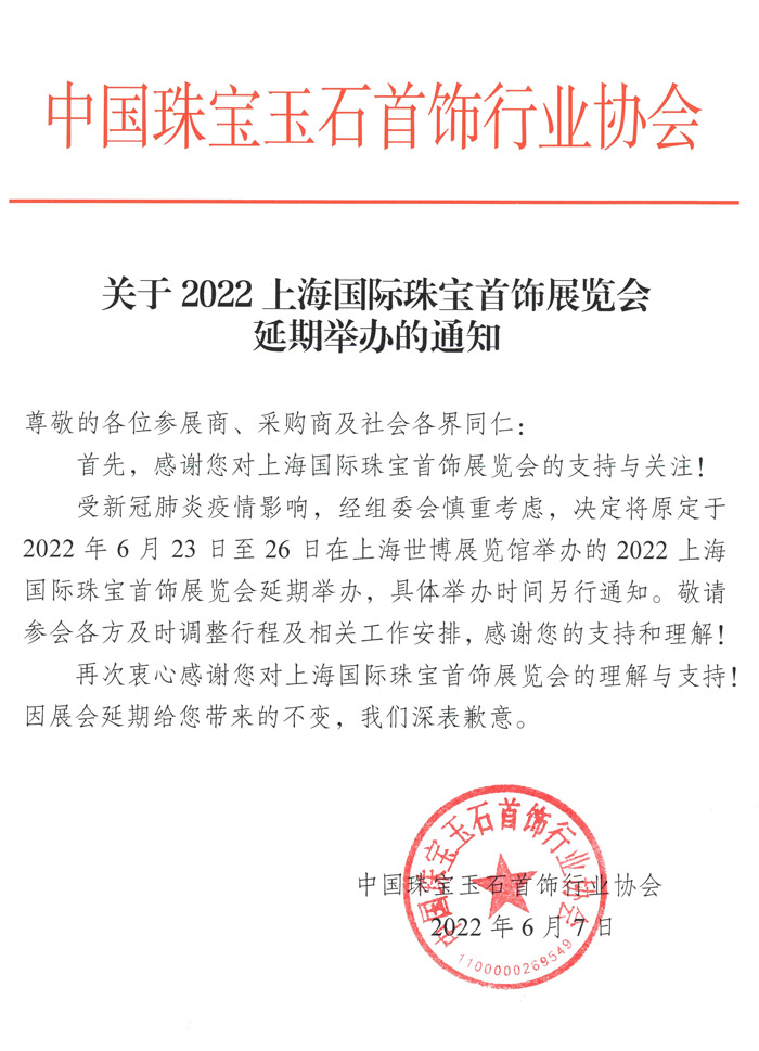 關(guān)于2022上海國際珠寶首飾展覽會延期舉辦的通知