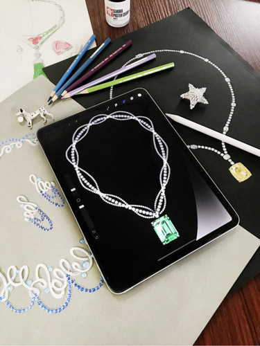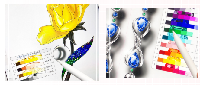 如果說傳統(tǒng)一筆一劃的手繪更加適用于高級定制珠寶的設(shè)計(jì)展示,那么iPad(平板電腦)板繪就是一種高效便捷的方式,最大限度保證設(shè)計(jì)實(shí)用性和適配性,提高設(shè)計(jì)修改速度。