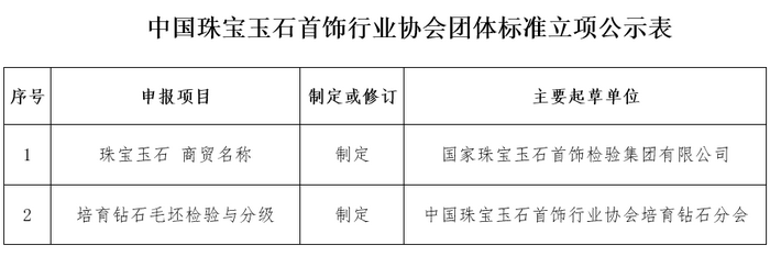 中國(guó)珠寶玉石首飾行業(yè)協(xié)會(huì)團(tuán)體標(biāo)準(zhǔn)立項(xiàng)公示