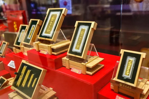 從2002年菜百股份全國首發(fā)第一根生肖題材賀歲金條——2003癸未(羊)年賀歲金條以來,賀歲金條系列已經(jīng)推出了21年,菜百股份和中國金幣集團有限公司也攜手走過了輝煌的二十余載。回顧經(jīng)典,歷久彌新,賀歲金條首發(fā)期間,菜百股份總店4層特別呈現(xiàn)了歷年賀歲金條紀念展,供廣大收藏愛好者品鑒。